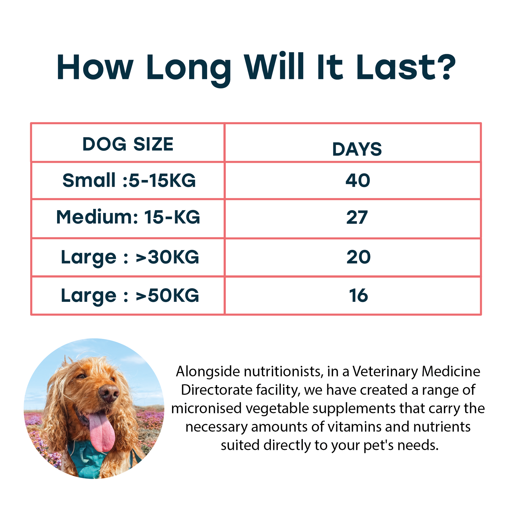 Incorporate it effortlessly into your dog's daily regimen by adding it to their regular kibble or wet/raw food, just once a day. The precise amount can be easily determined based on your pet's size and specific needs.